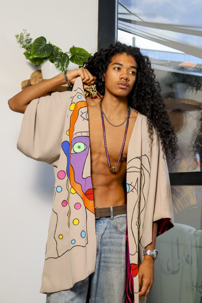 Visage Kaléidoscope: Kimono beige fluide, transformé en toile d’expression. Un visage abstrait, coloré et vibrant, entre émotion et spontanéité.