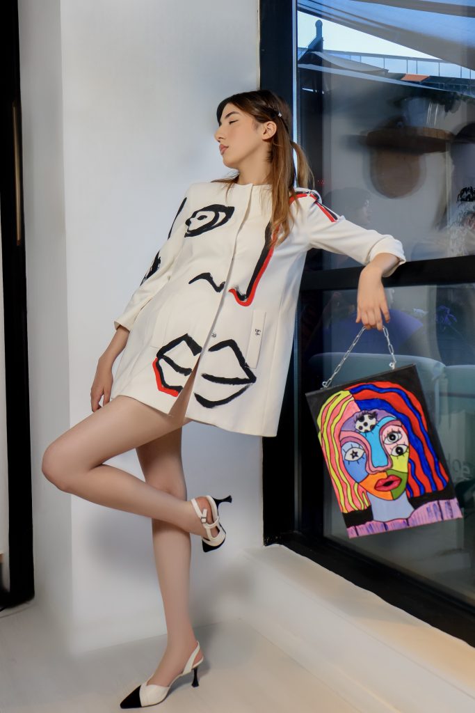 A head-turning ensemble: hand-painted suitcase, jacket, and hat, each turned into a bold statement. Abstract faces, vibrant tones, spontaneous lines, every detail tells a story.